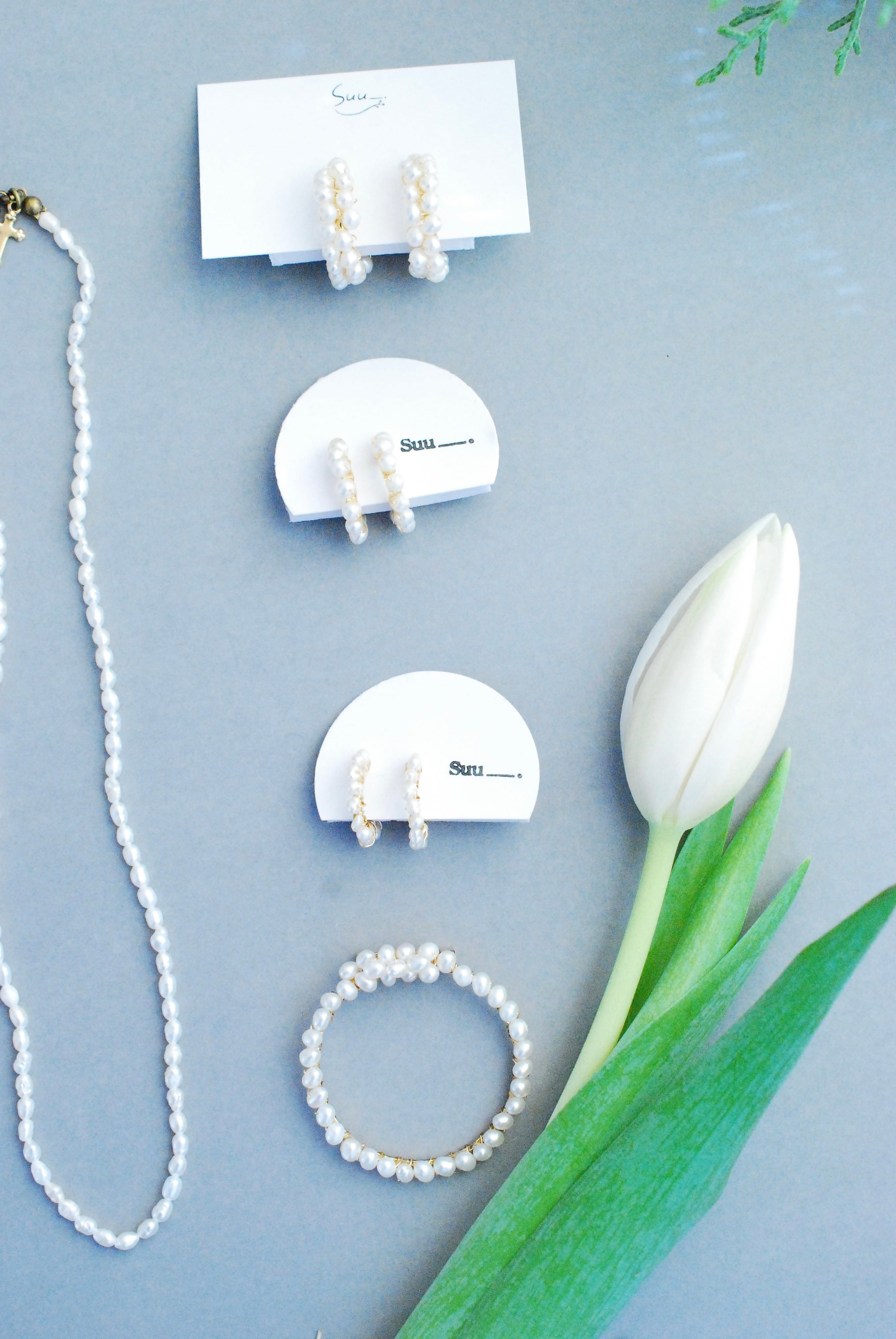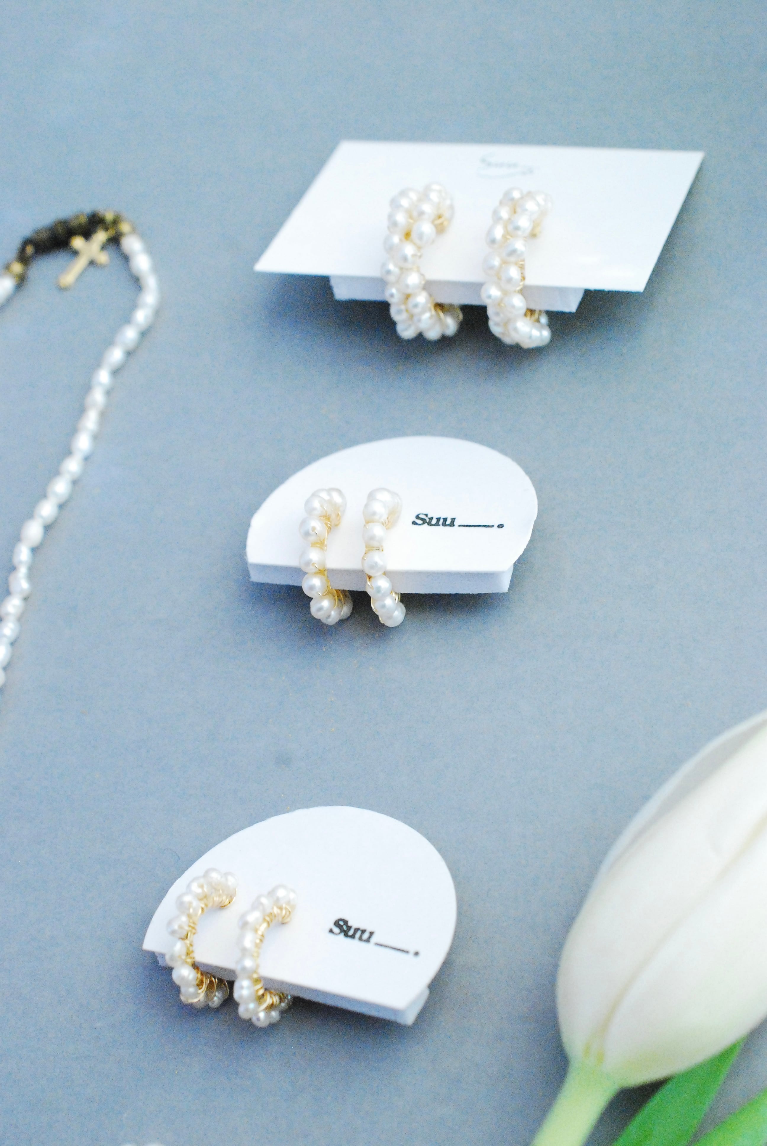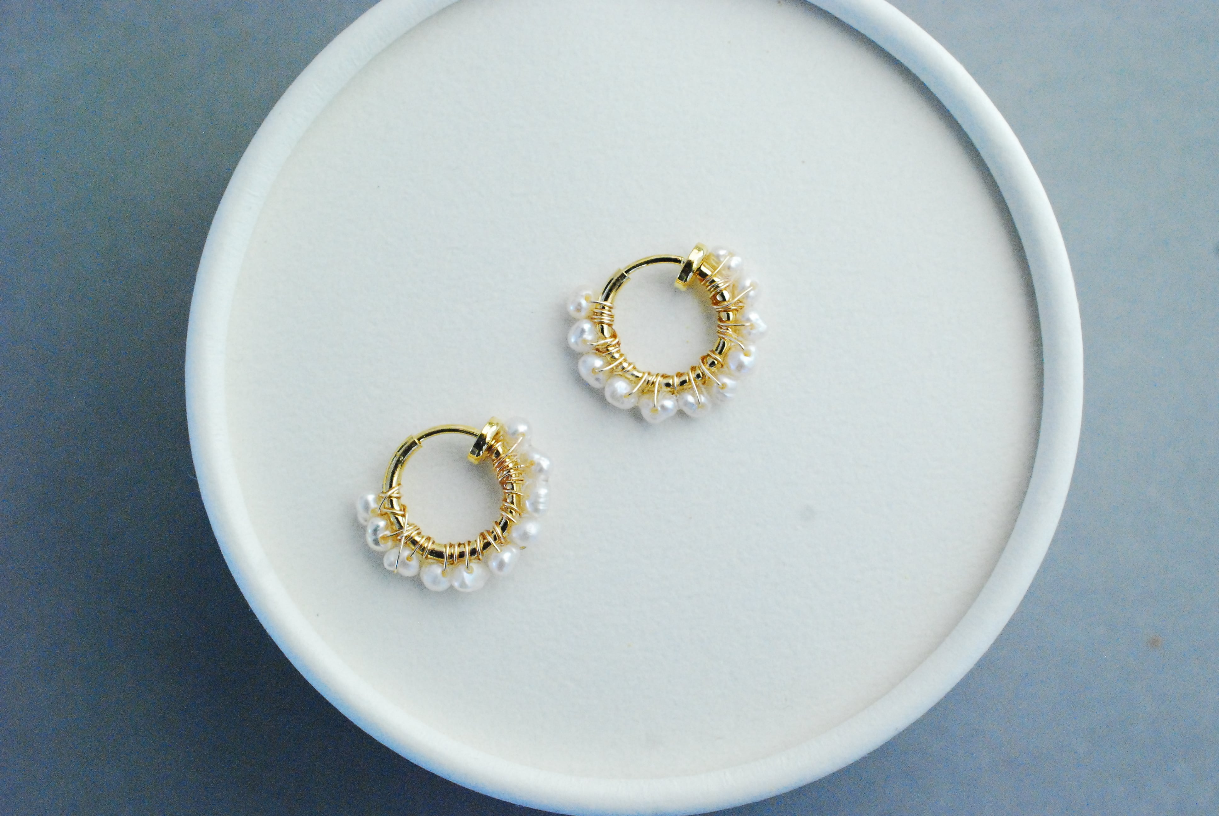 ミニフープ 極こつぶの淡水パールが1連で整列しています。